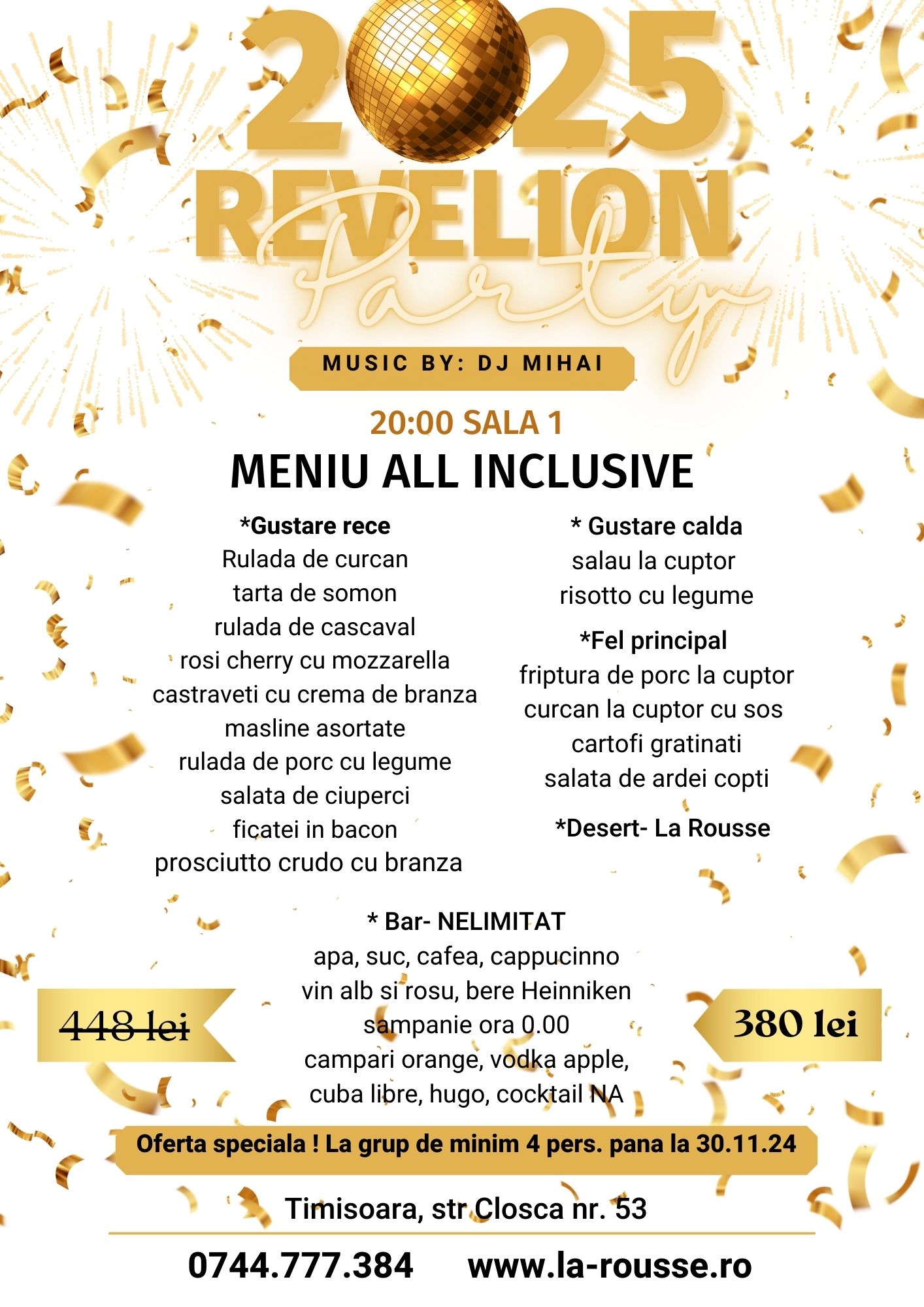 Restaurant La Rousse din Timisoara va invita sa intampinati noul an alaturi de prieteni intr-o atmosfera deosebita, cu muzica de toate genurile – cu DJ ALEX ( sala Romantic) si muzica live cu DANA VARADI (sala Elegance), si un meniu delicios atent pregatit cu un pachet de bauturi nelimitat!
